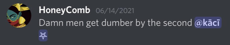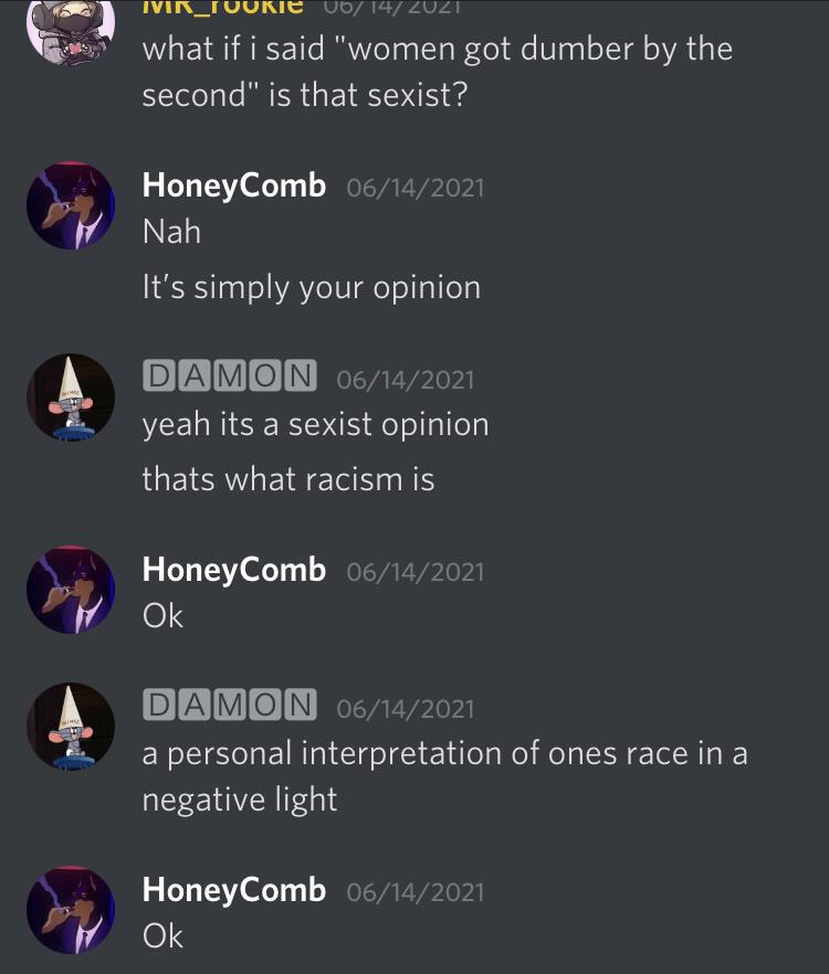 Oxytin regularly made "jokes" putting men down in a similar manner to radical feminists, who regularly put down men in a similar manner while denying transphobia and racism. Oxytin also denied that believing woman are inferior is sexism, calling it "just an opinion."