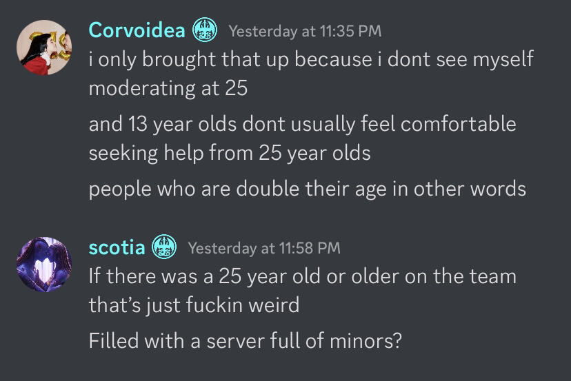 Scotia argued that any adult over 25 who would be interested in moderating an all-ages Wings of Fire server is "fucking weird."