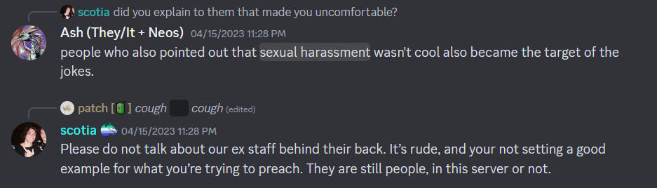 Scotia regularly shut down conversations critical of Cassiopea, even ones centered around constructive criticism of Talons of Peace and analyzing the impact he had on the server.