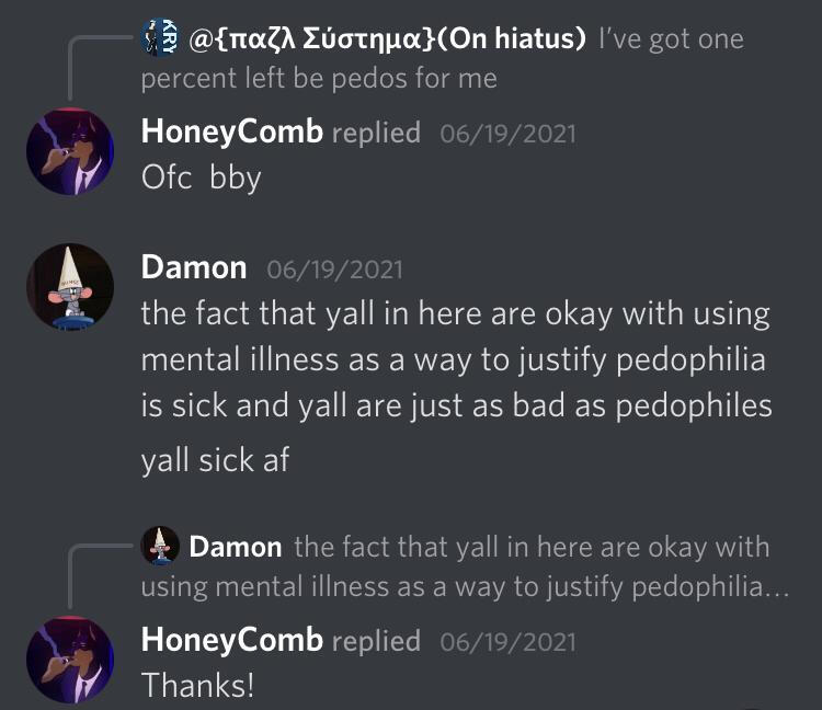 Oxytin made "jokes" about being a pedophile, which included justifying pedophilia as a mental illness.