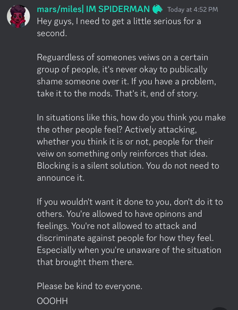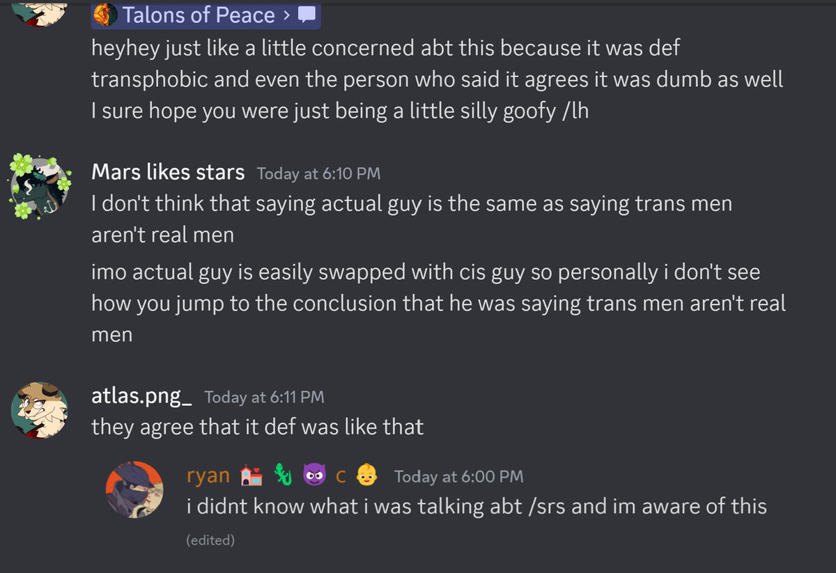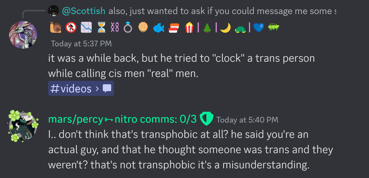 Mars excused someone who implied that trans men were not "actual men," despite multiple transgender people saying that the statement was incredibly transphobic. Later, Mars reprimanded a user for saying that they were blocking someone who admitted to being unironically homophobic towards all queer people.