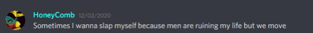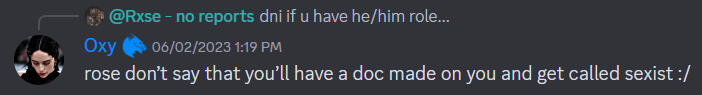 Oxytin regularly made "jokes" putting men down in a similar manner to radical feminists, who regularly put down men in a similar manner while denying transphobia and racism. Oxytin also denied that believing woman are inferior is sexism, calling it "just an opinion."