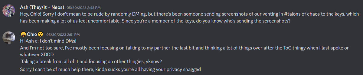Mars and Blade were affiliated with the Keys, as shown by the fact that they both put a "key" symbol in their bios. This group was shown to request access to private venting channels about Talons of Peace only to share complaints with anyone they knew personally that was discussed.Ohio, an adult member of the Keys, joined Talons of Chaos to leak our vents to the Keys at the request of Mars and Blade. Mars admitted that both he and Blade were involved with spying on Talons of Chaos, and they have not faced any repercussions.